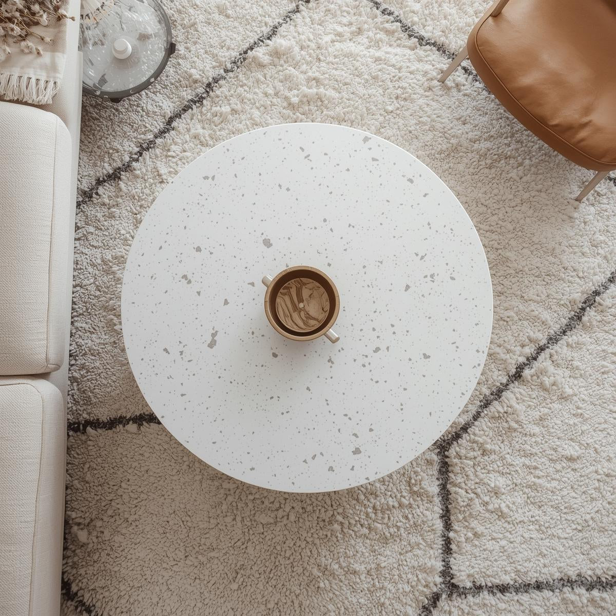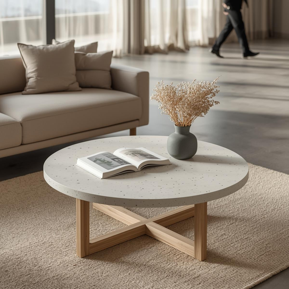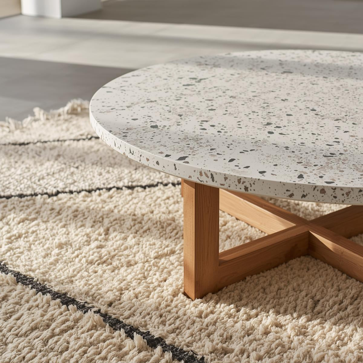 La table basse TESSA associe un plateau en terrazzo à un piètement en bois massif,