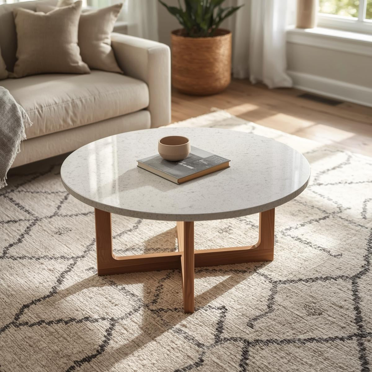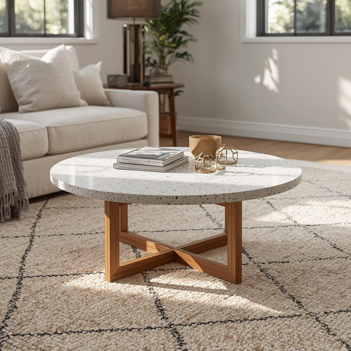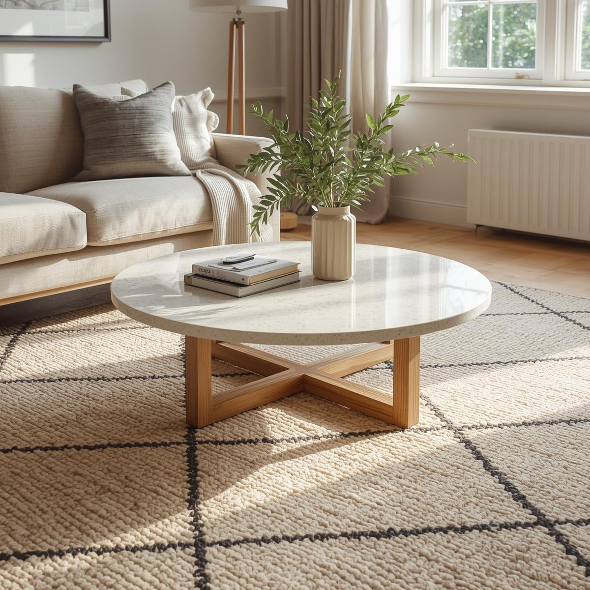La table basse TESSA associe un plateau en terrazzo à un piètement en bois massif,